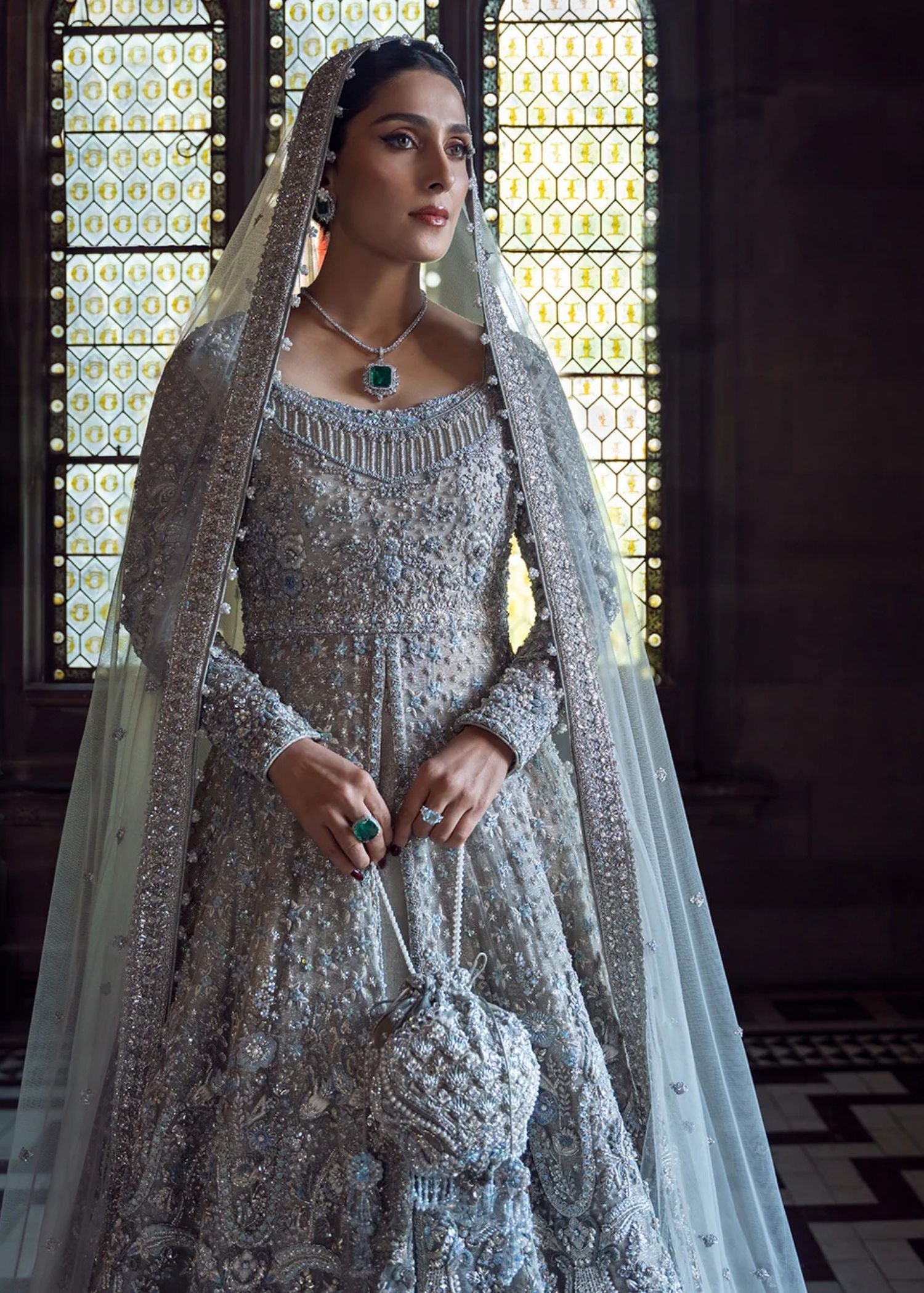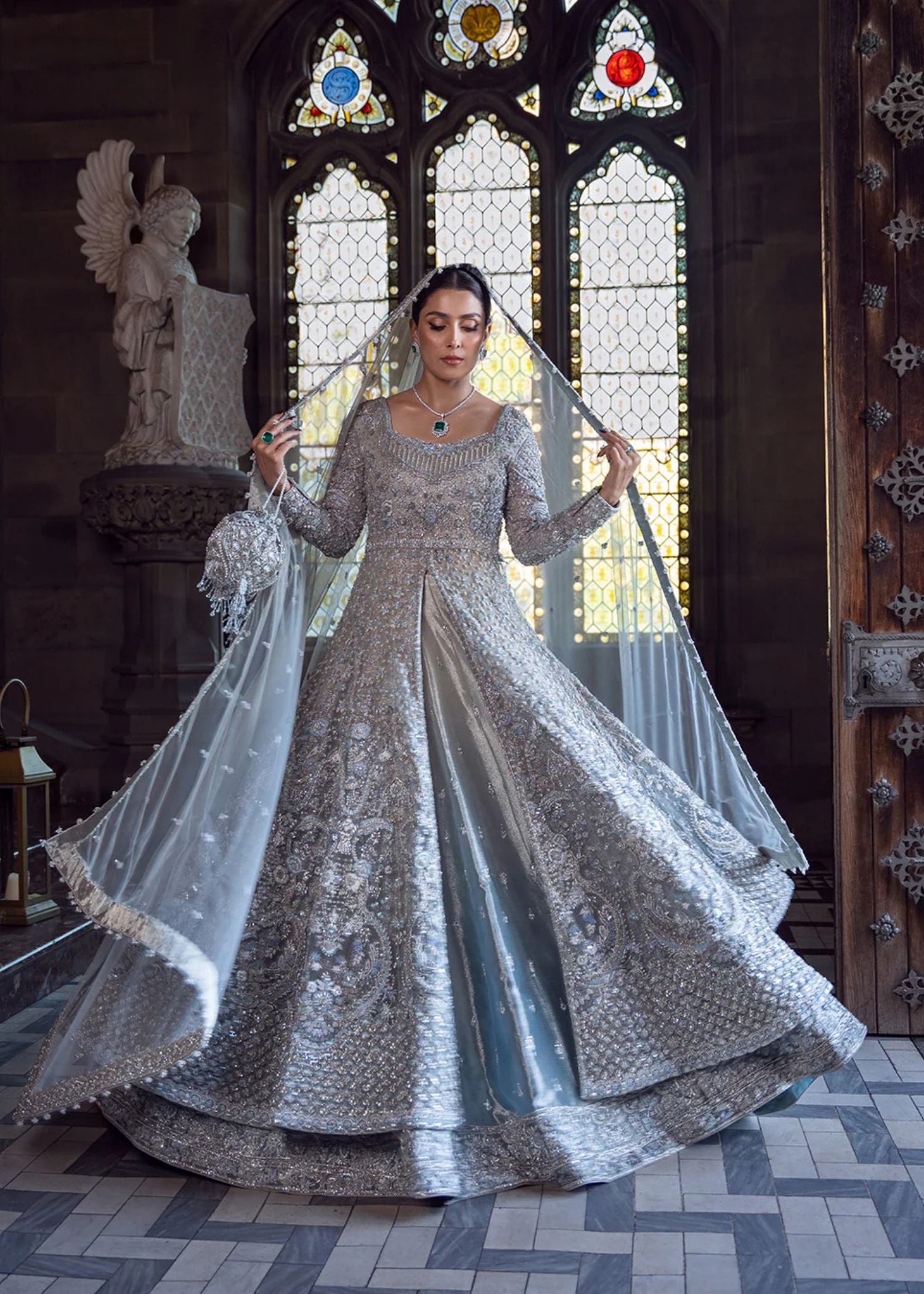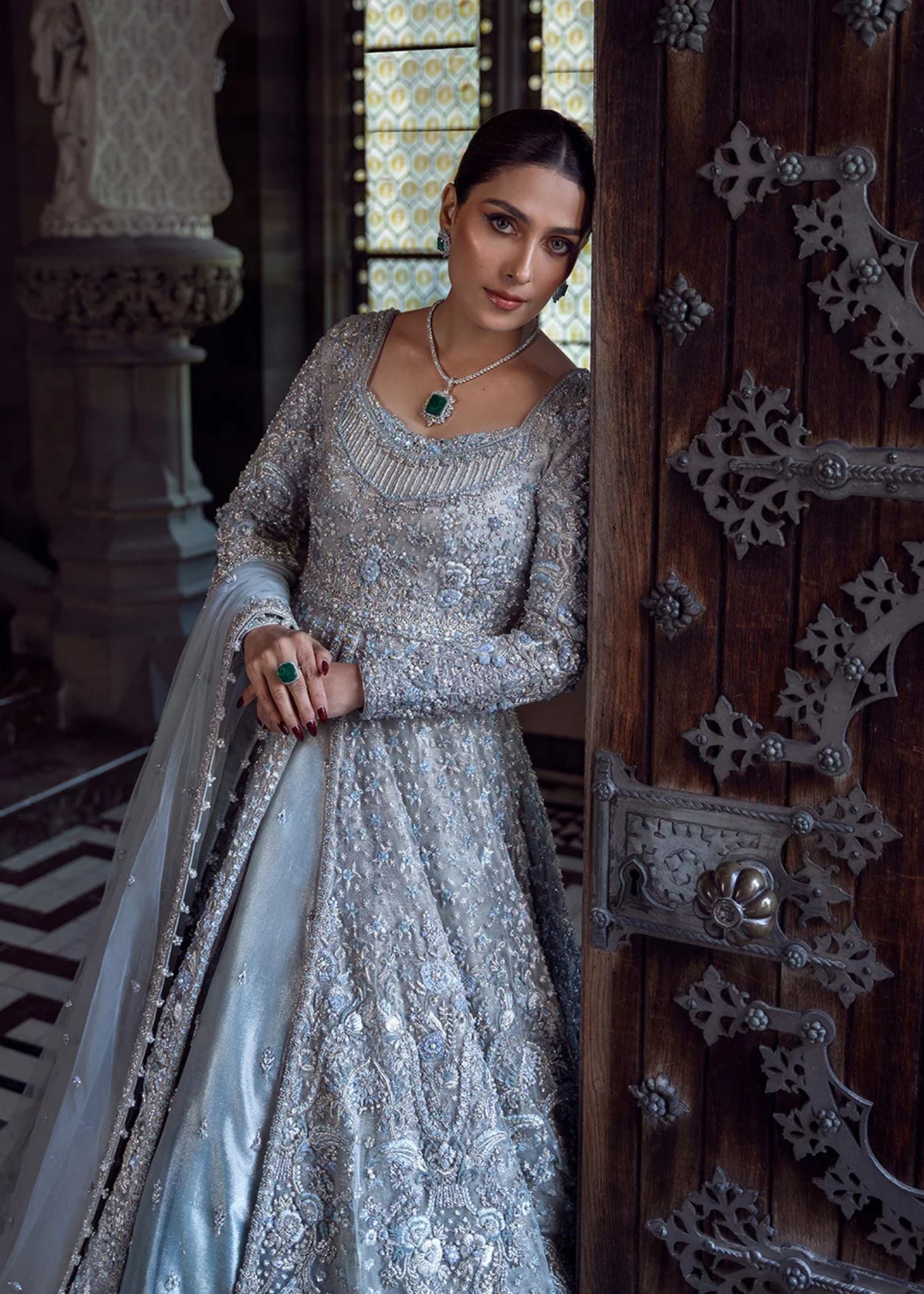 The enchanting Ayana rendered in ice blue is a vision of scintillating allure. The bridal set is intricately adorned with patterns of intertwining floral and three-dimensional motifs etched in resham, zardozi and crystal work. The panels flaunt resham flora and booti jaal etched in time-honoured techniques of kora and naqshi among others. This open cut pishwas is paired with an ornate tissue dupatta for an elegant statement.