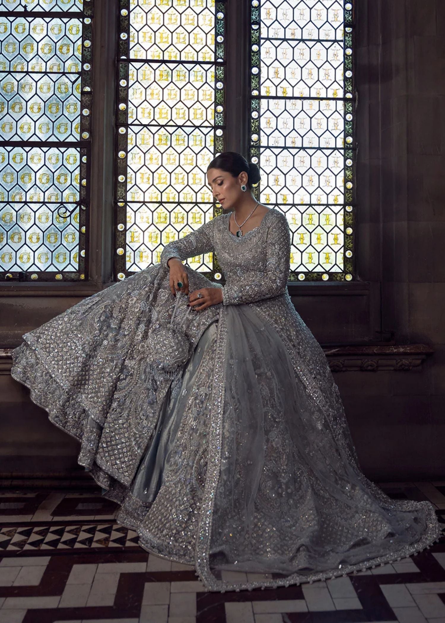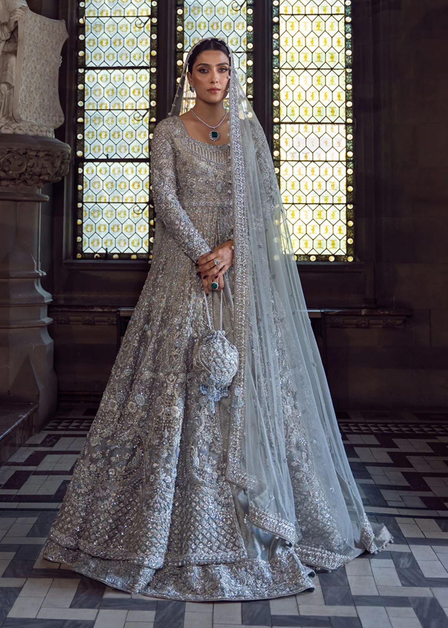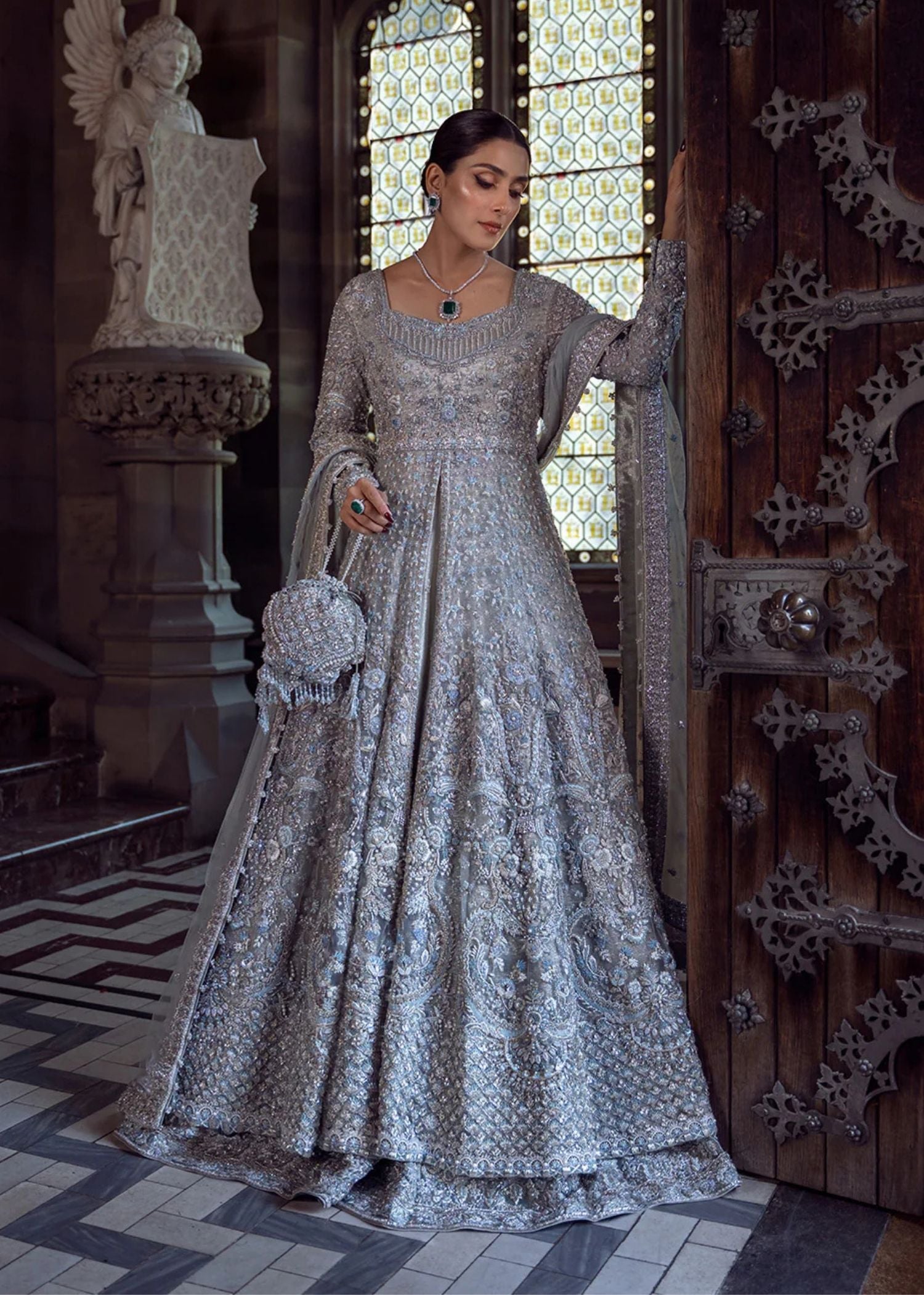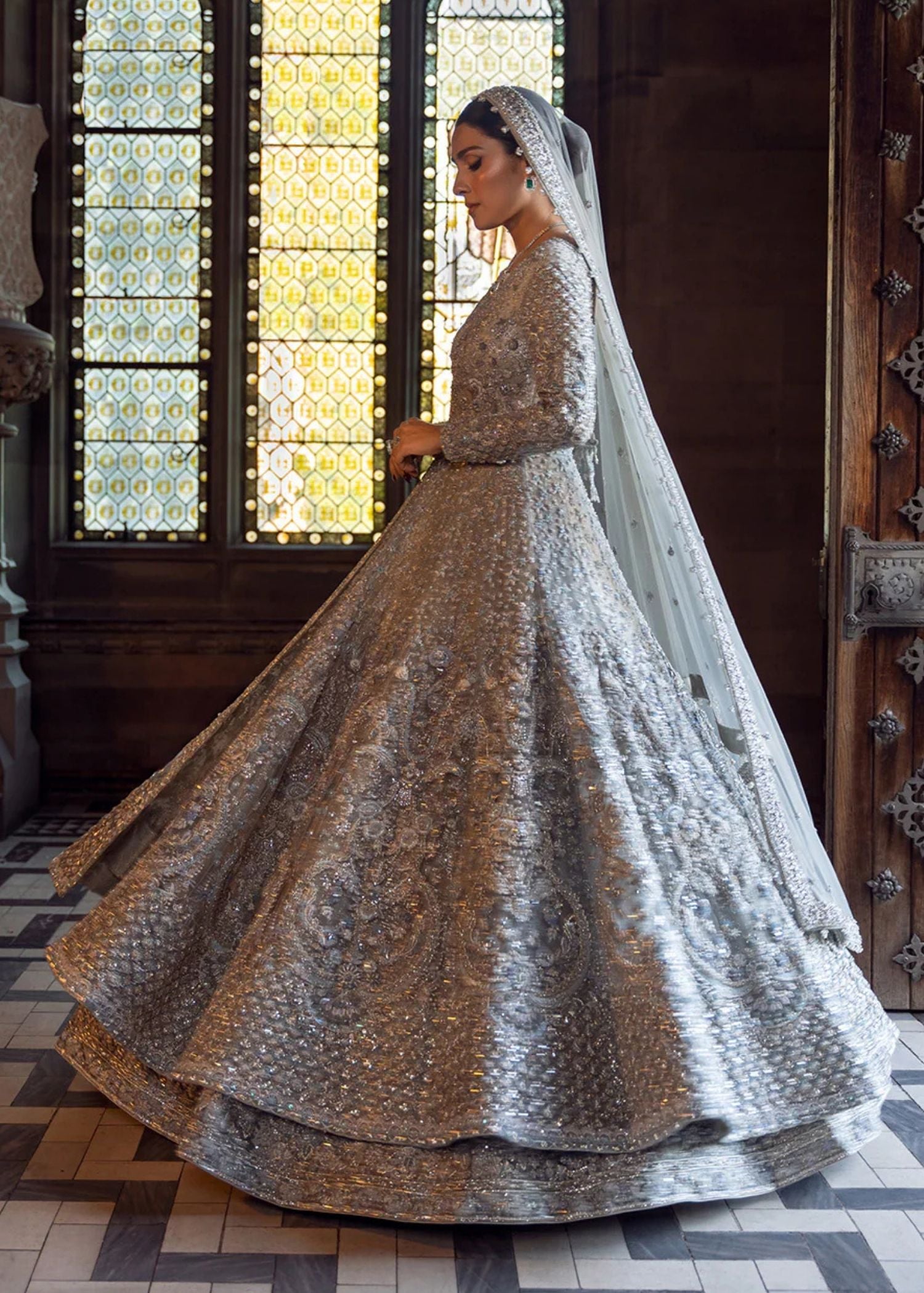 The enchanting Ayana rendered in ice blue is a vision of scintillating allure. The bridal set is intricately adorned with patterns of intertwining floral and three-dimensional motifs etched in resham, zardozi and crystal work. The panels flaunt resham flora and booti jaal etched in time-honoured techniques of kora and naqshi among others. This open cut pishwas is paired with an ornate tissue dupatta for an elegant statement.
