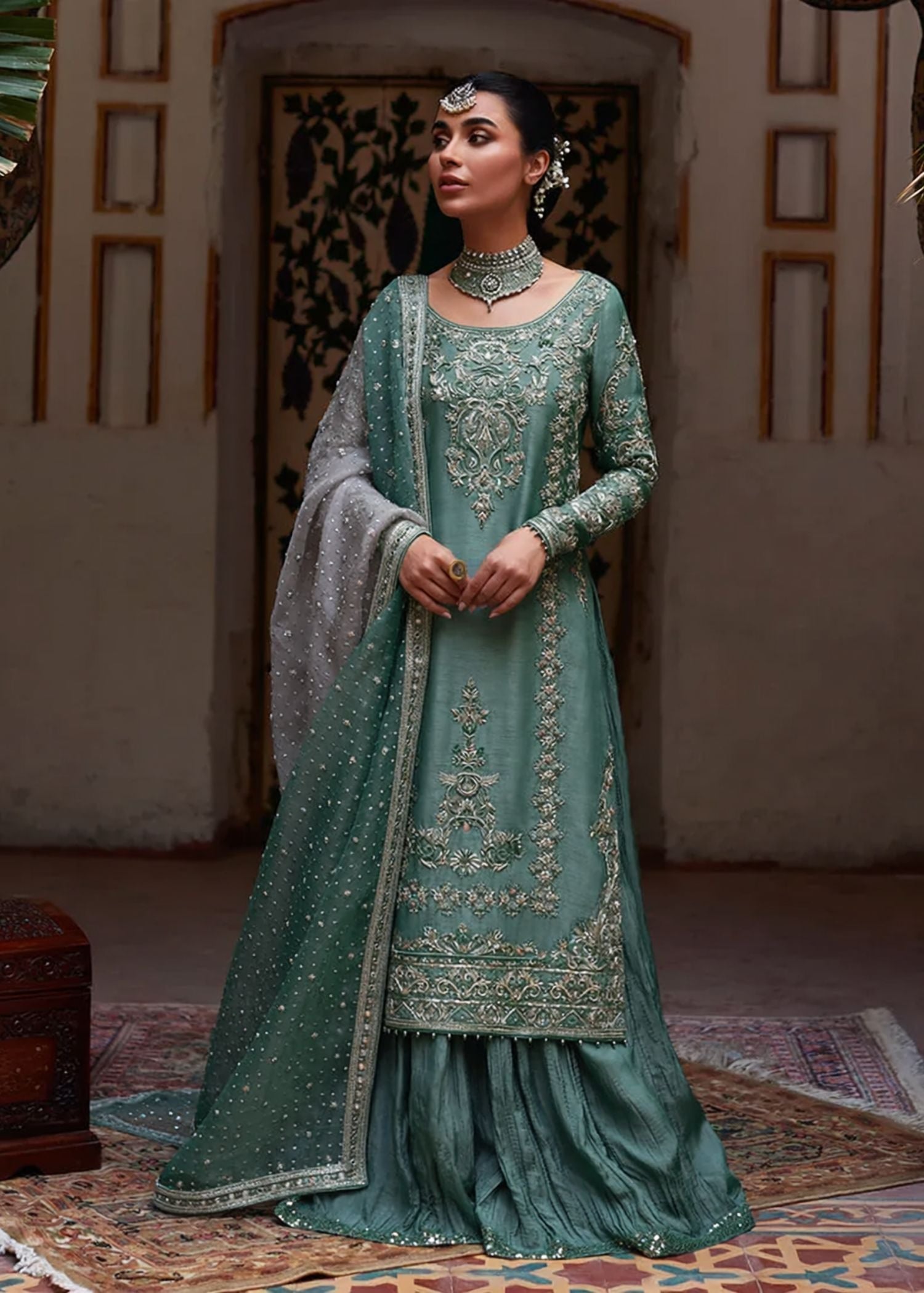 Rendered in cool shade of green, Dila features elegant floral motifs on the shirt and sleeves. Layered over a crushed sharara and paired with a sheesha embellished dupatta this classic silhouette is ideal for your upcoming festivities.