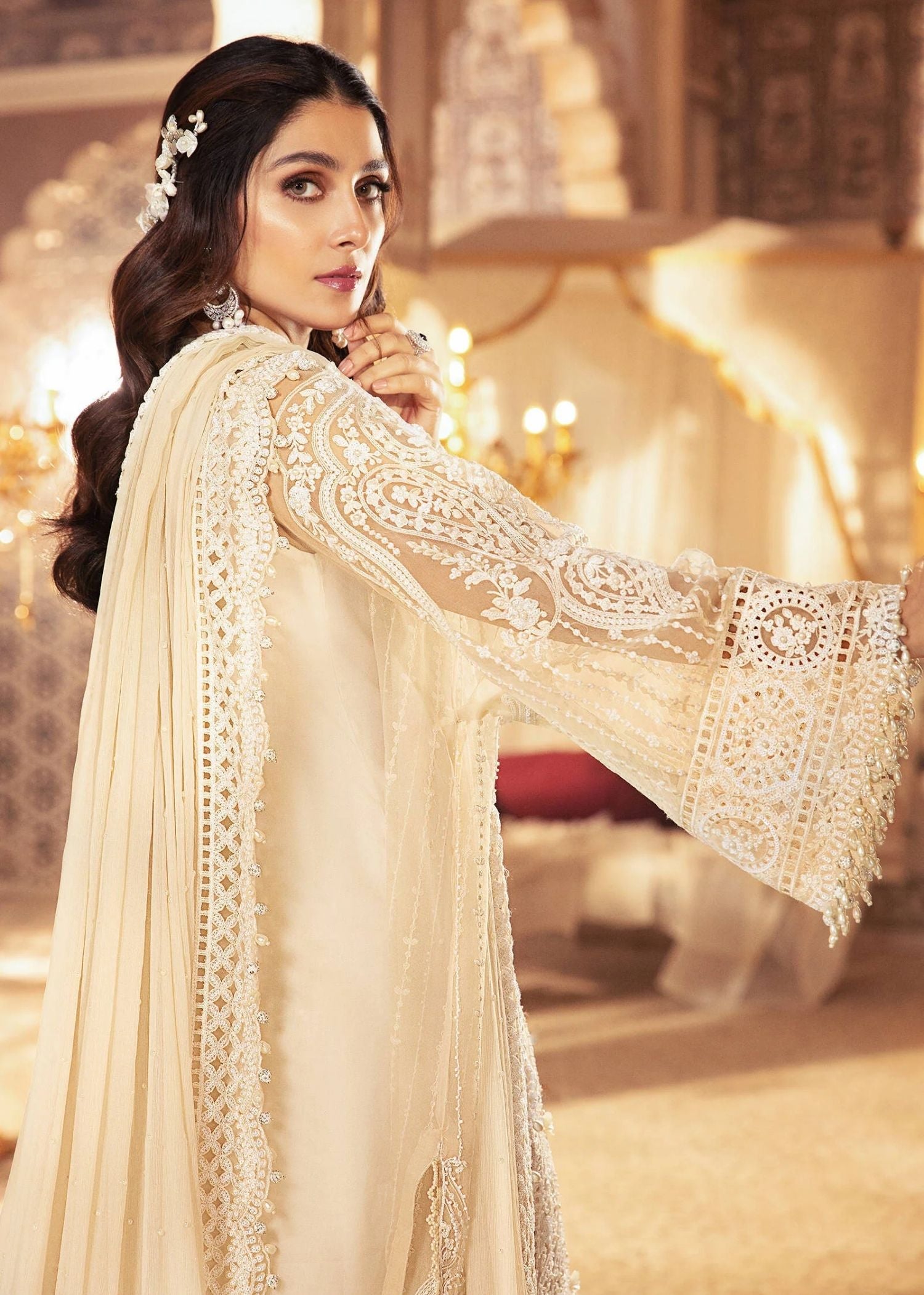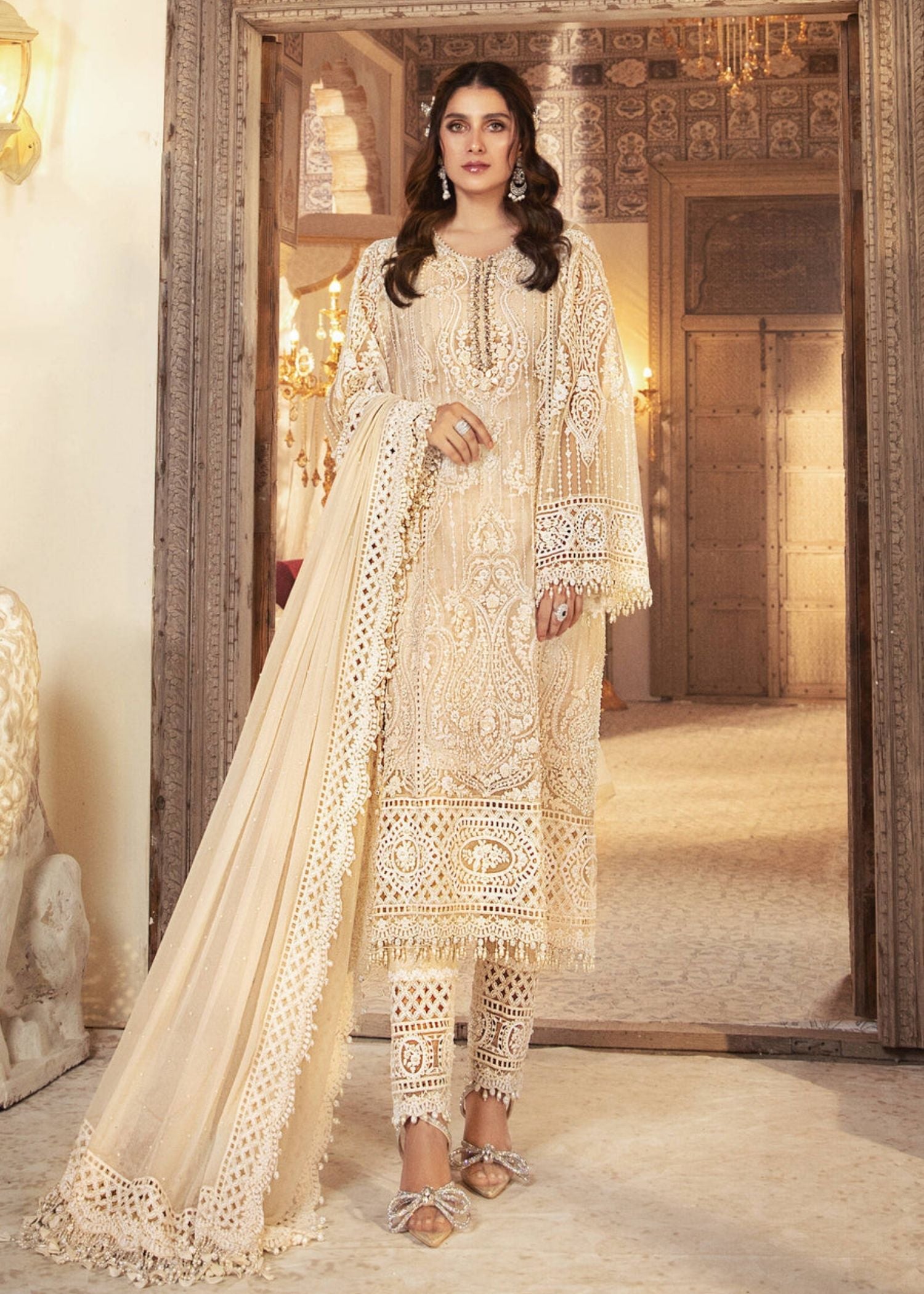 Fully hand embellished work on organza fabric with chiffon dupatta with laser cut pattern.