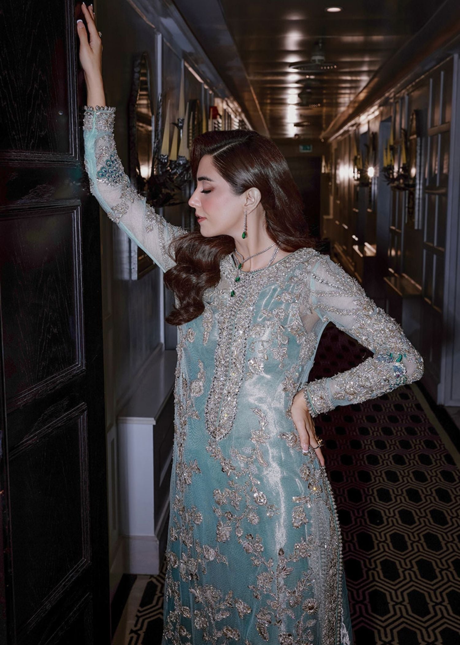 Ferozeah is a elegant long shirt, designed in a serene aqua tone,ornamented with intricate silver embellishments. The hand embellished patterns, featuring floral motifs, are complemented by delicate handwork, creating a refined and luxurious jal across the outfit.
