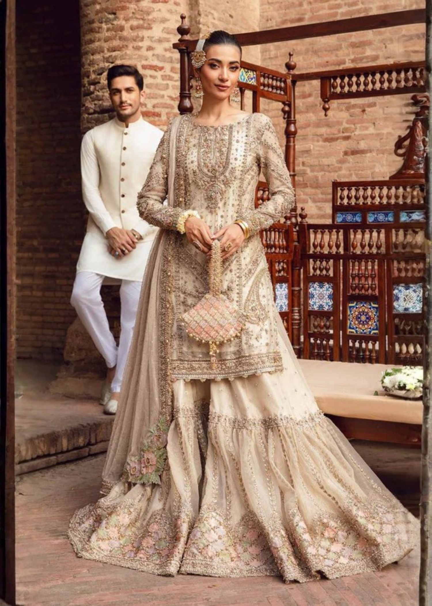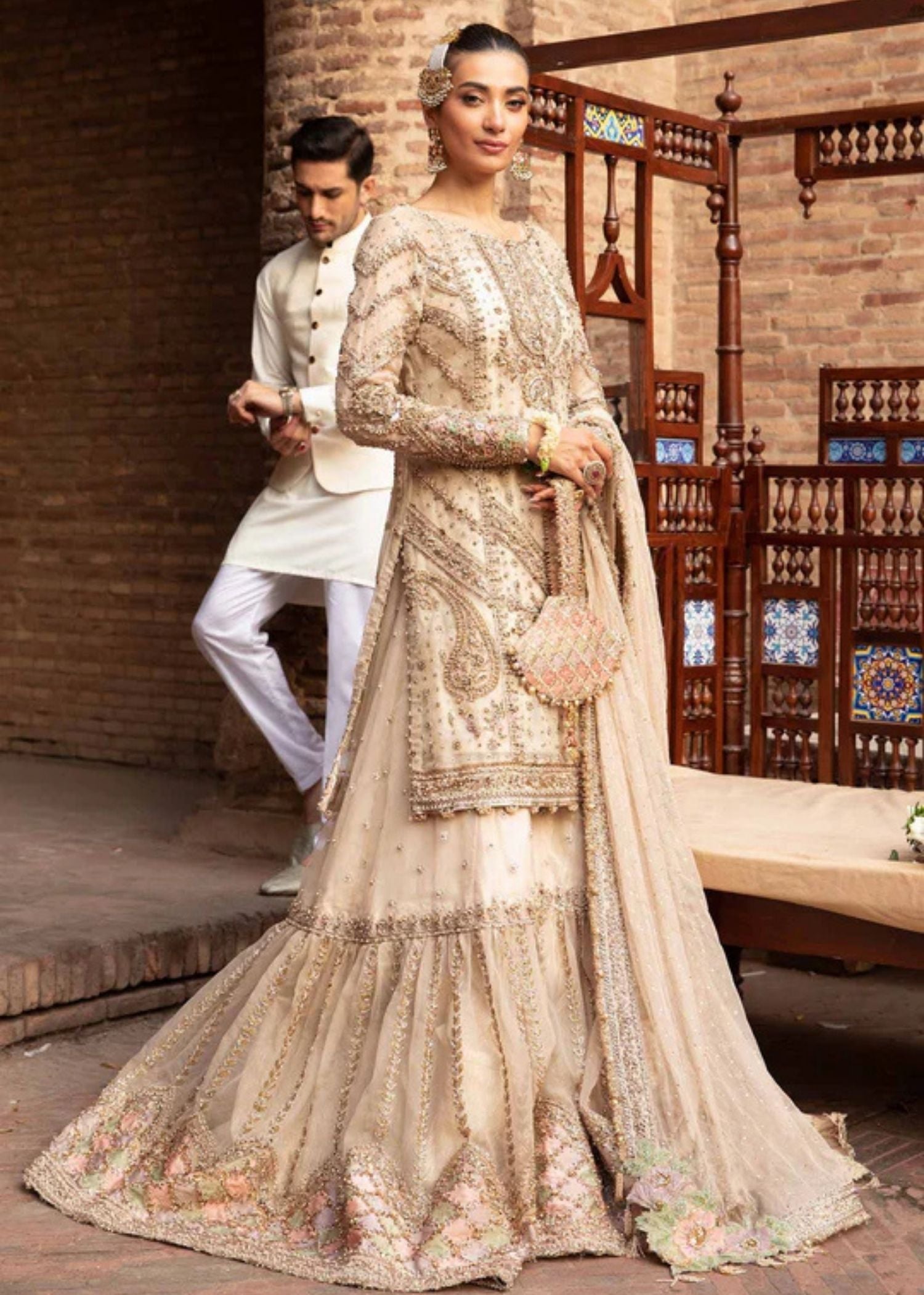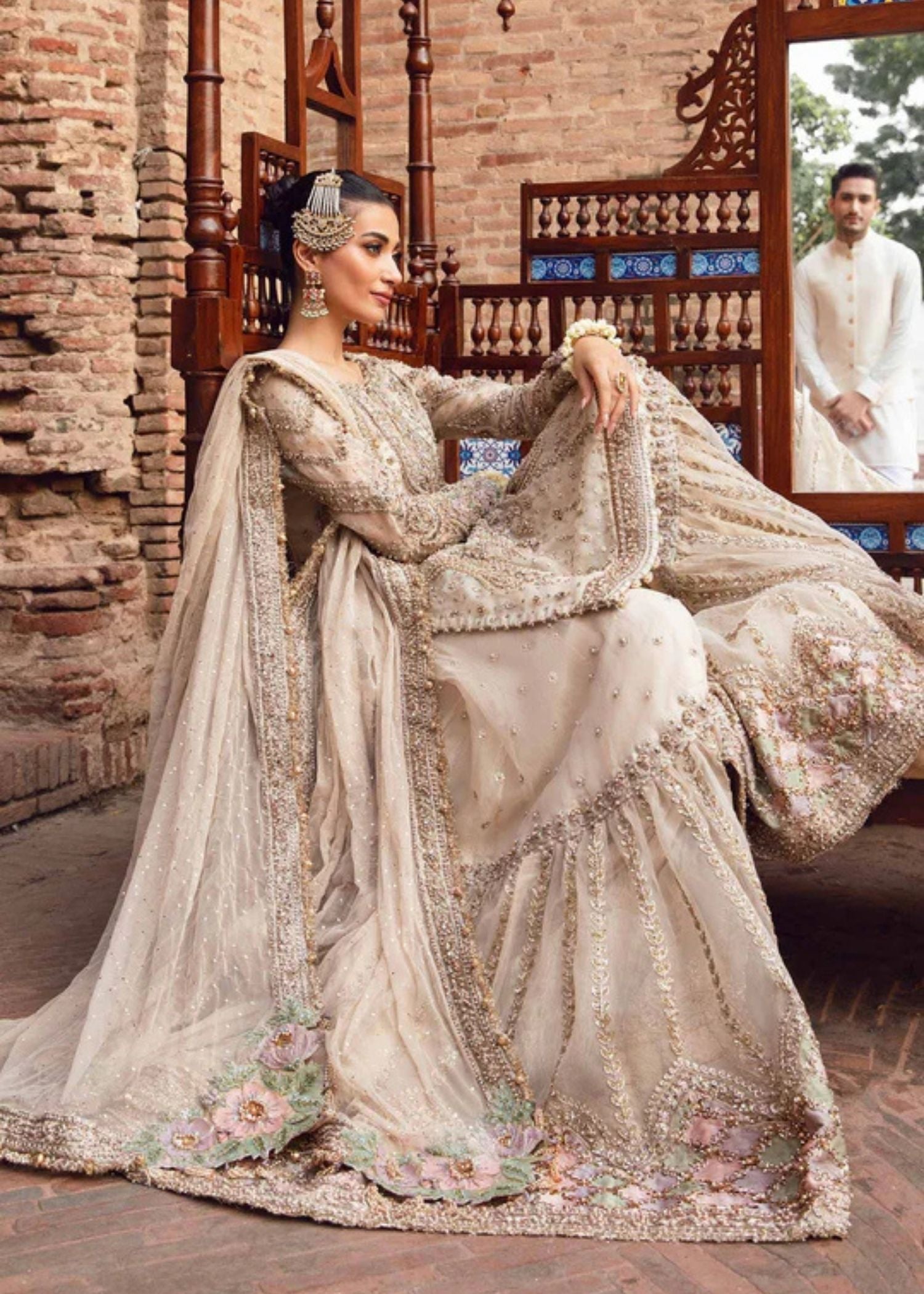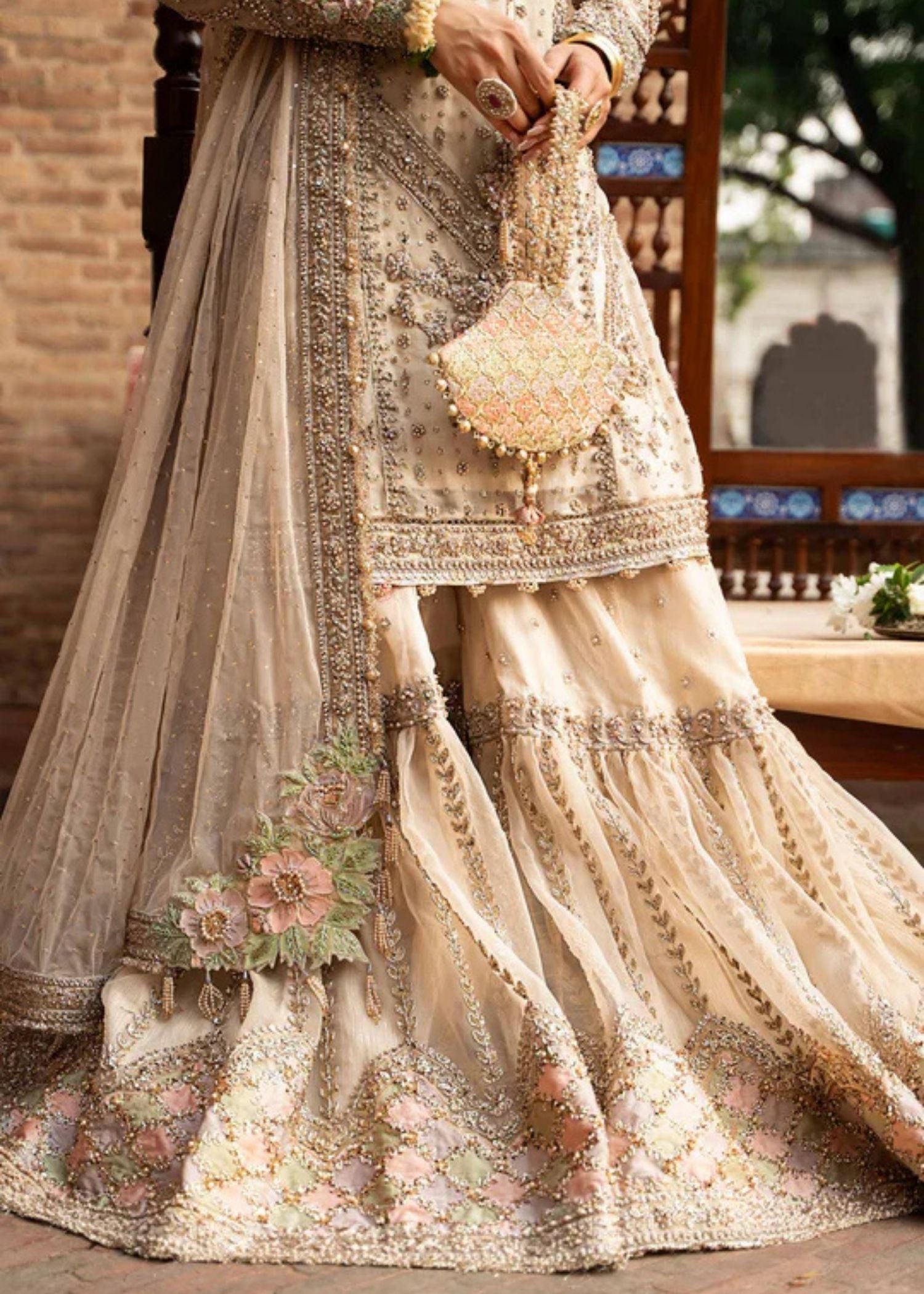 Embrace the timeless allure of 'Ishtar', a glorious creation in a heavenly ivory palette. This gharara set features an enchanting array of traditional & paisley patterns, rendered with exquisite applique work, creating a striking composition with glistening kundan, zari & cutdana bead embroidery. Surrounded by an elegantly mukesh work & lavishly adorned with cascades of delicate pearls, stones, tassels & glistening sequins, this piece is a hallmark of sophistication. Accompanied by a sumptuous mukesh dupatta that whipers of luxury while making it a perfect choice for a luxurious engagement, nikah, shendi & shalima occasion.