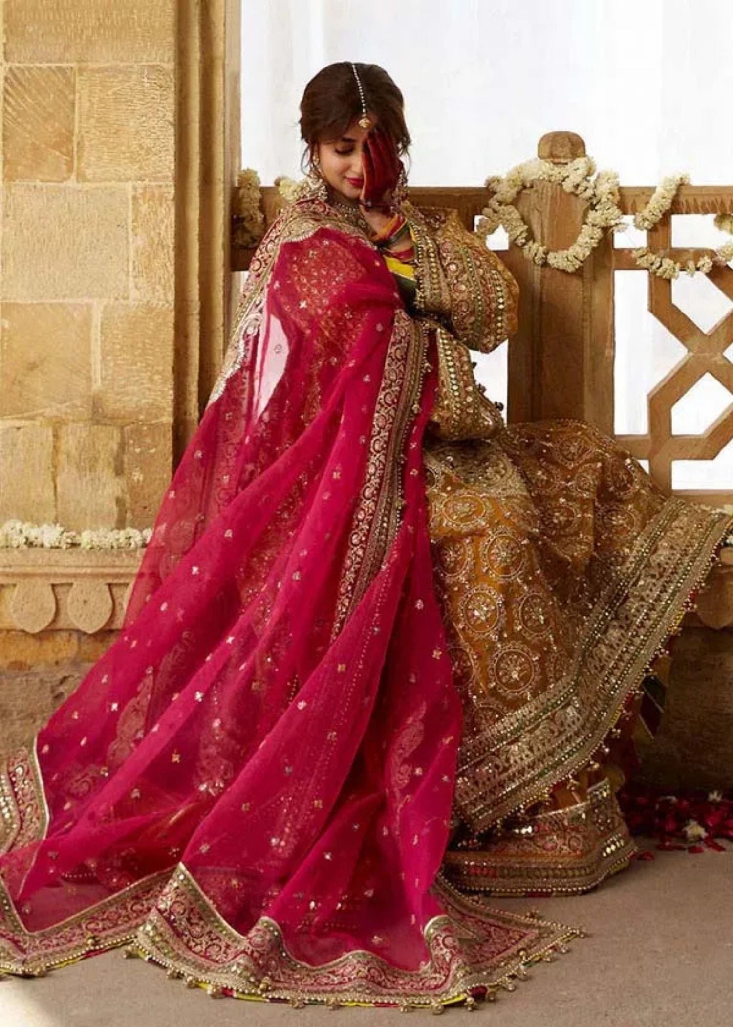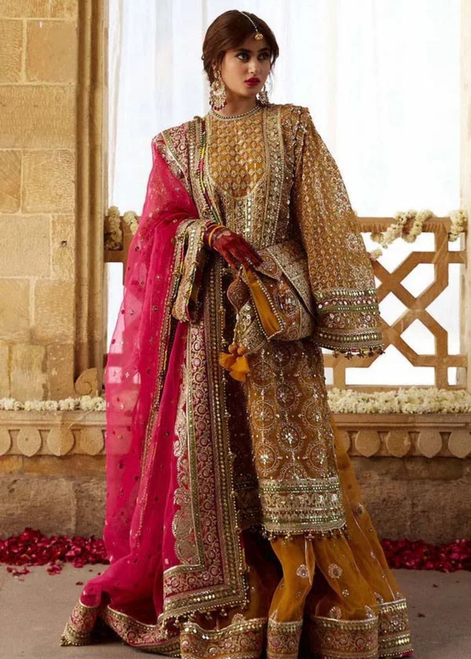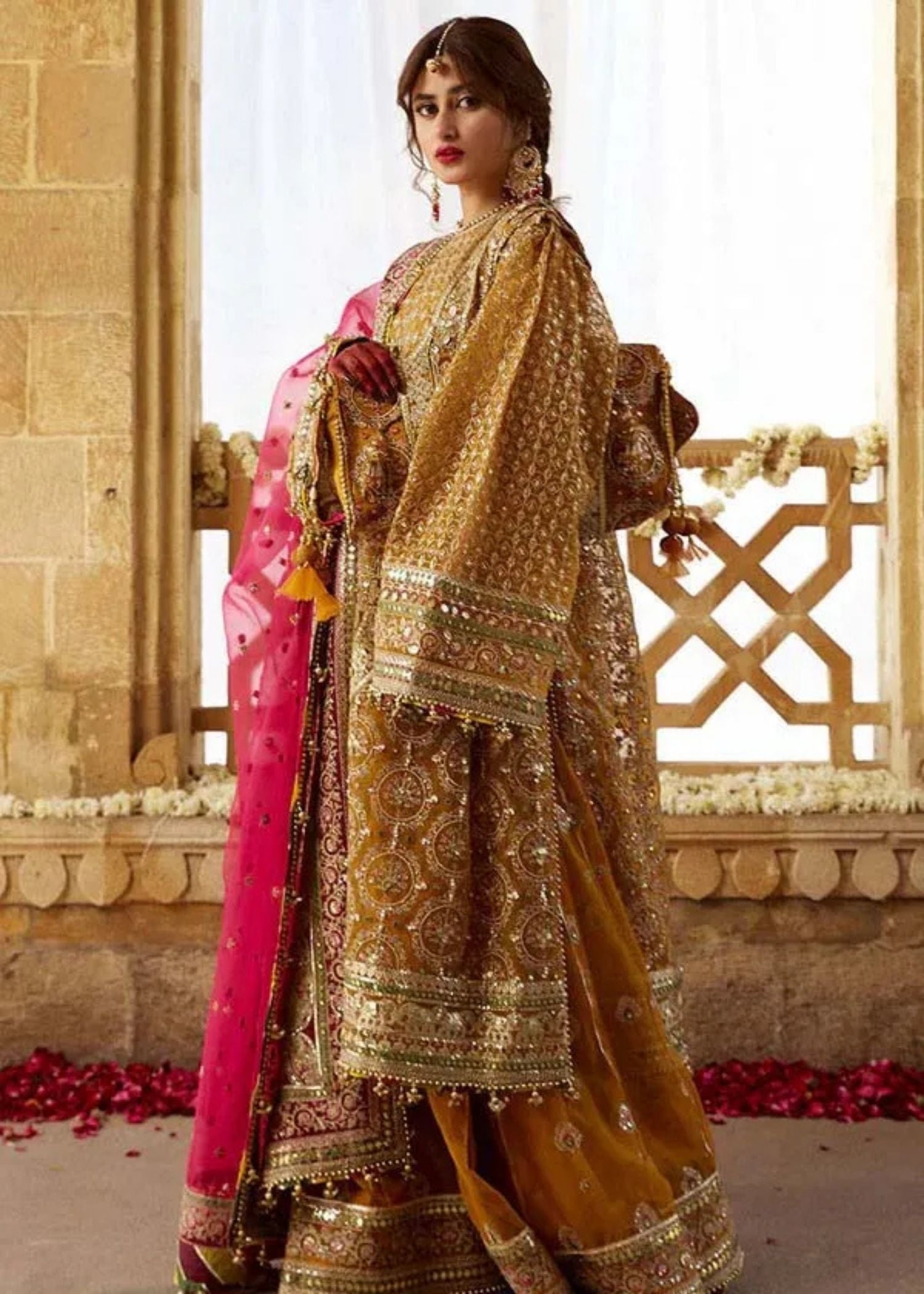 Sajal poses away in Kesari, rustic shades of mustard packed with a punch of our signature atishi gulabi. It features a lose fit Kashmiri phiran style kameez doused in a beautiful jaal of embroidered floral vines and carefully placed signature motifs enhanced by hand embellished accents of gota, hand cutsequins, pearls and cutdana . It comes with a generously embroidered sharara with heavy borders and an atishi gulabi dupatta with a delicate spray of floral motifs framed with chunky embroidered borders with dainty paisleys and geometric lines.