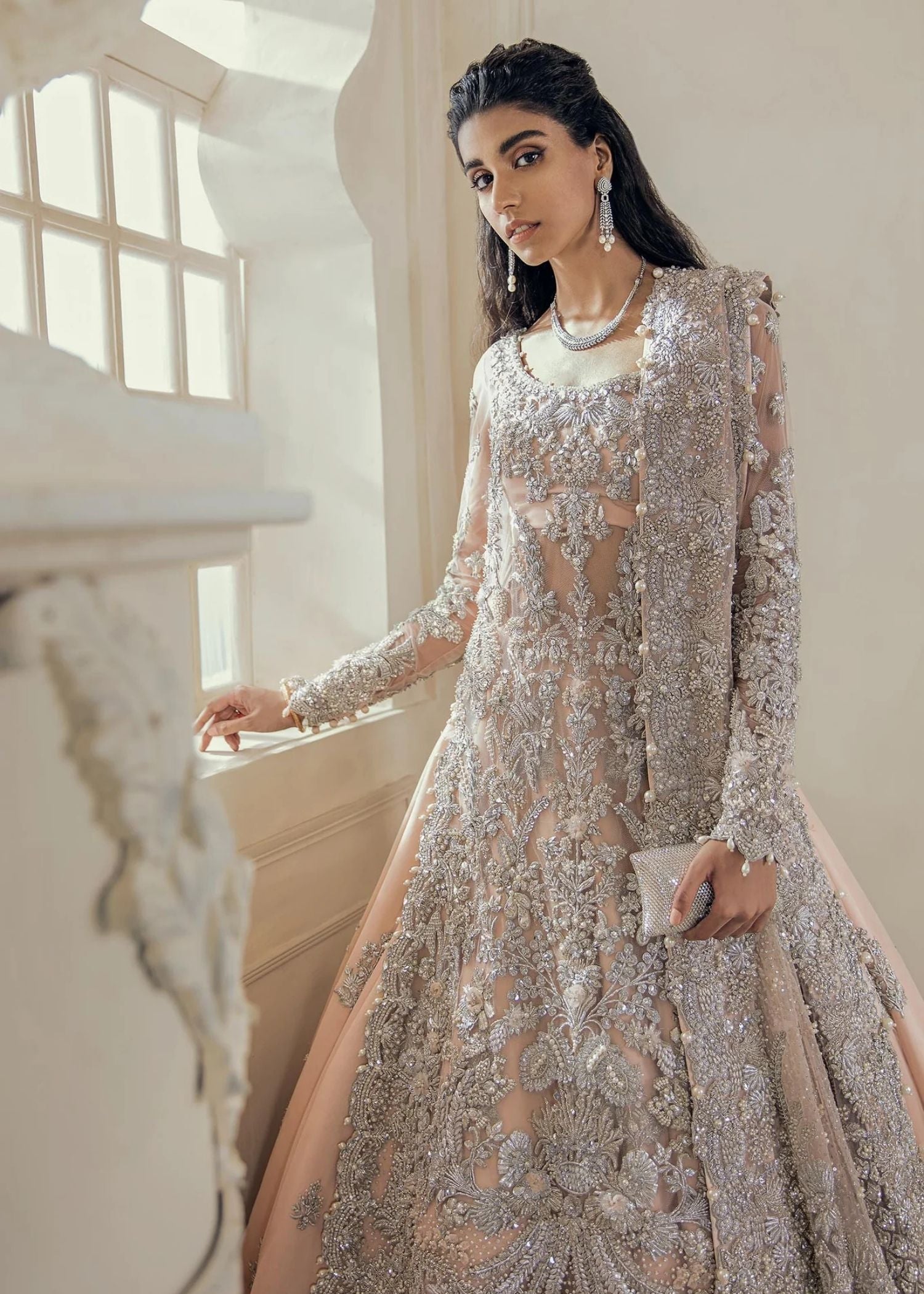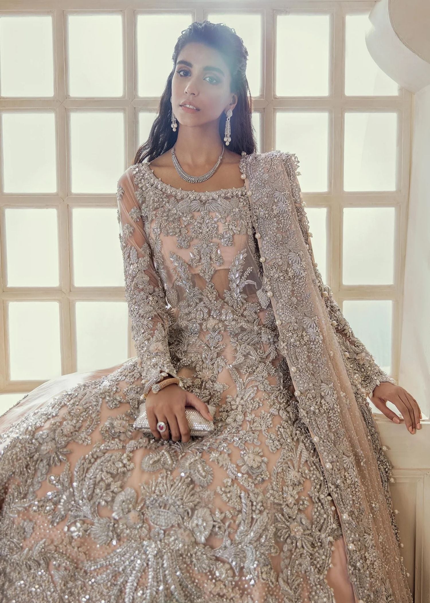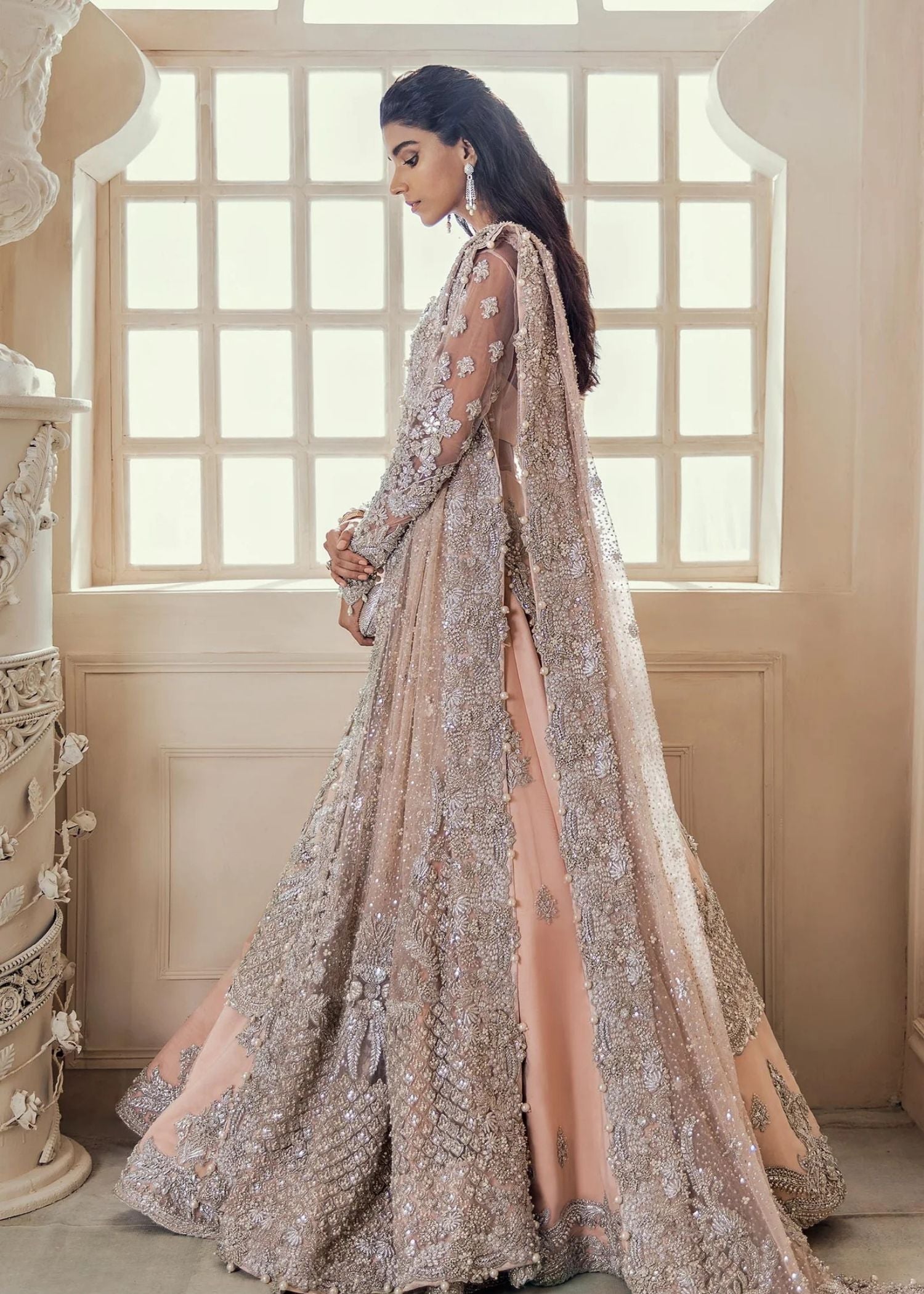Bringing to life the quintessential Élan romance and charm, this bridal pairs a long exquisite shirt in pétillant coral, heavily embellished with hand-sewn slivery floral motifs and filigree with a laboriously embellished net dupatta, finished with traditional extensive borders in varying shades of light Sirocco. The bisque coloured sharara printed with a pearl river border peeps through and lends grandeur to this dreamy ensemble.