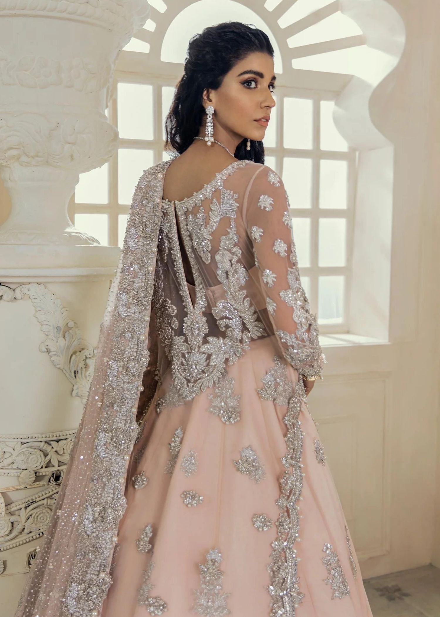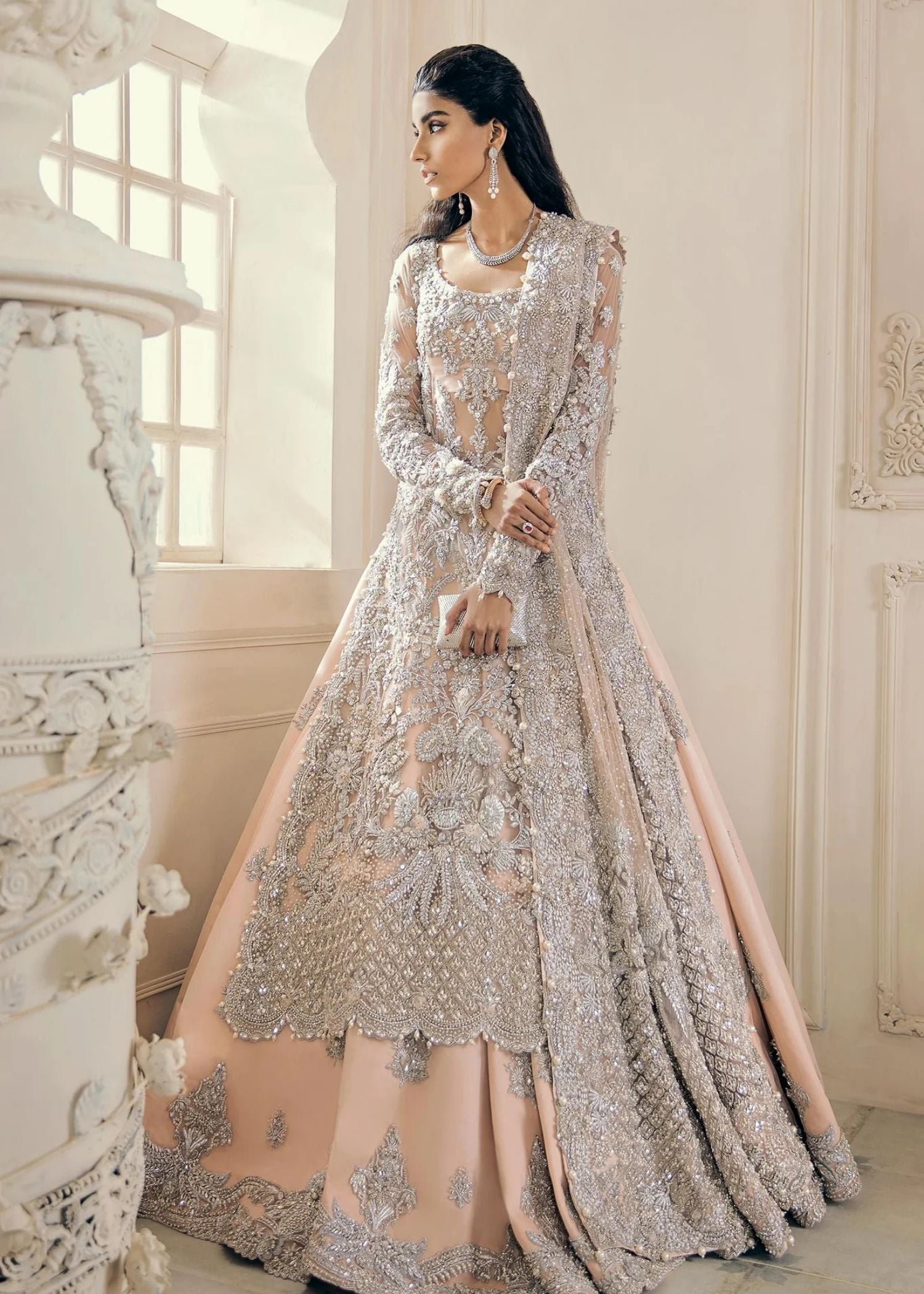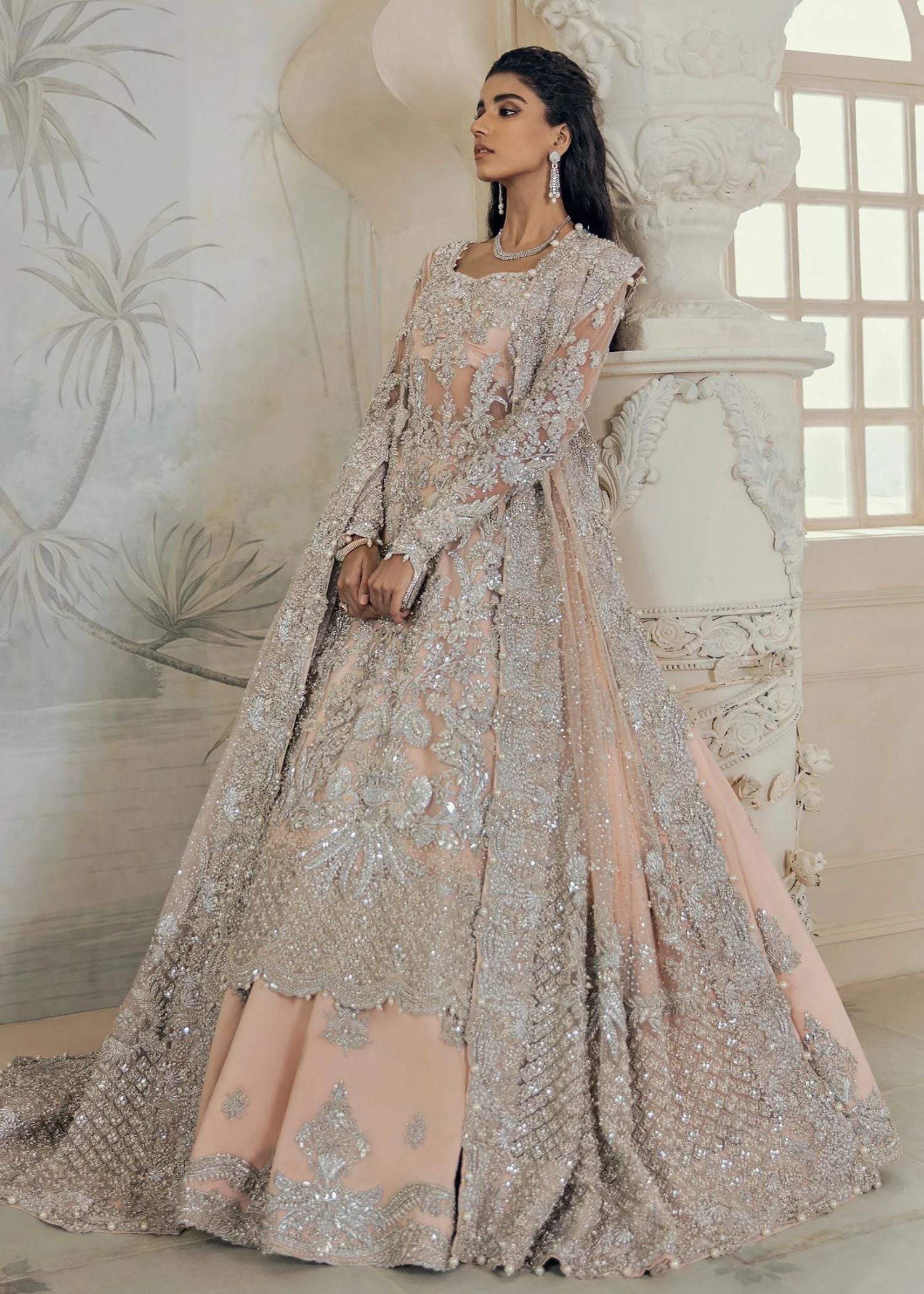 Bringing to life the quintessential Élan romance and charm, this bridal pairs a long exquisite shirt in pétillant coral, heavily embellished with hand-sewn slivery floral motifs and filigree with a laboriously embellished net dupatta, finished with traditional extensive borders in varying shades of light Sirocco. The bisque coloured sharara printed with a pearl river border peeps through and lends grandeur to this dreamy ensemble.