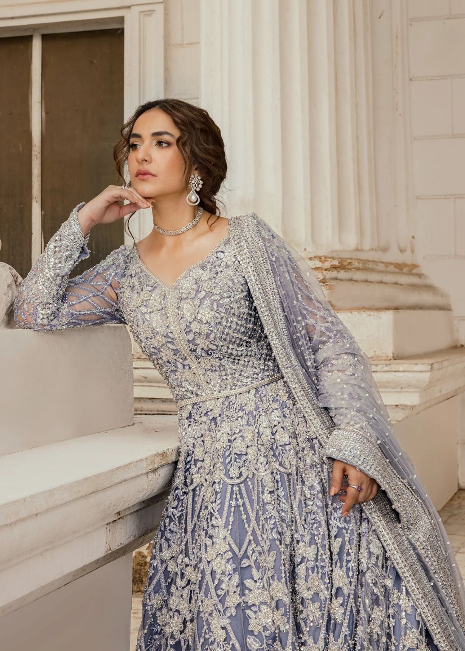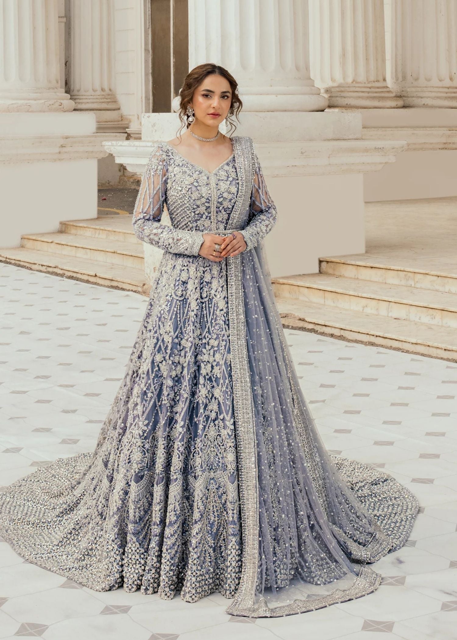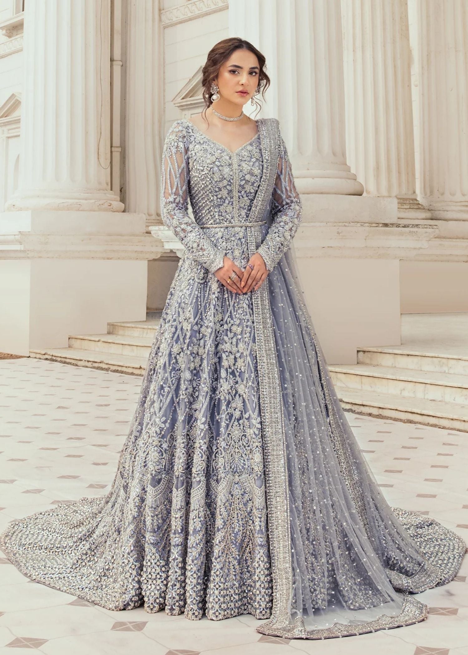 Grandeur iced blue net peshwas with royal tail features signature hand embroidery, finished with handwork and glistening sequins. The look will give you head-turning, timeless charm, whatever the season. The ensemble is paired with an embellished net dupatta with detailed borders paired with larger-than-life veil with intricate detailing