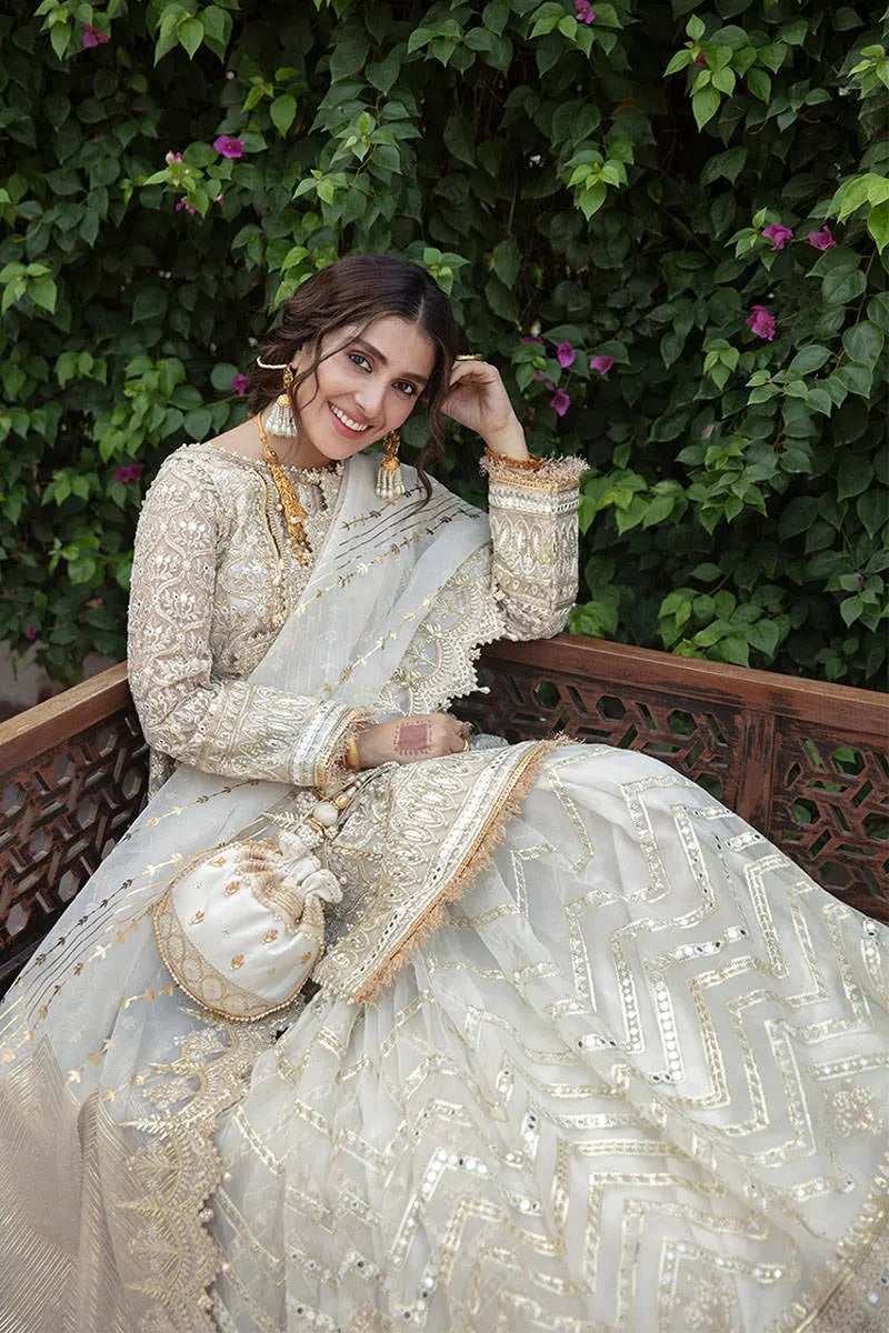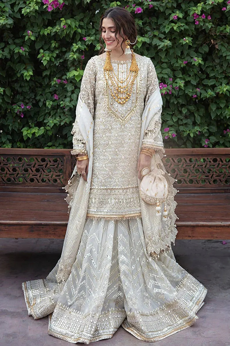 A white tonal organza shirt is heavily embroidered with resham and gotta panni. A composed neckline with gotta, sitara, tilla marori and finished with a composed border. It is paired with an organza gharara with a chevron patterned gotta pani embroidery with heavily embroidered borders. The organza dupatta is foil printed and finished with embroidered borders.