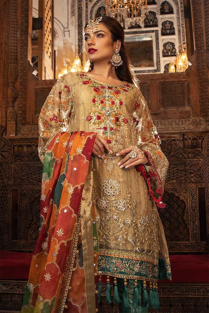 Make a grand statement this festive season with this luxurious organza ensemble, beautifully crafted. The outfit is adorned with intricate zari, resham, and sequins embroidery, adding a radiant glow to its traditional charm. The look is elevated with a multi-shaded velvet dupatta, featuring vibrant hues of orange, green, and maroon — a perfect blend of heritage and modern grace. The aqua blue embroidered trousers add a refreshing contrast, completing the majestic look.