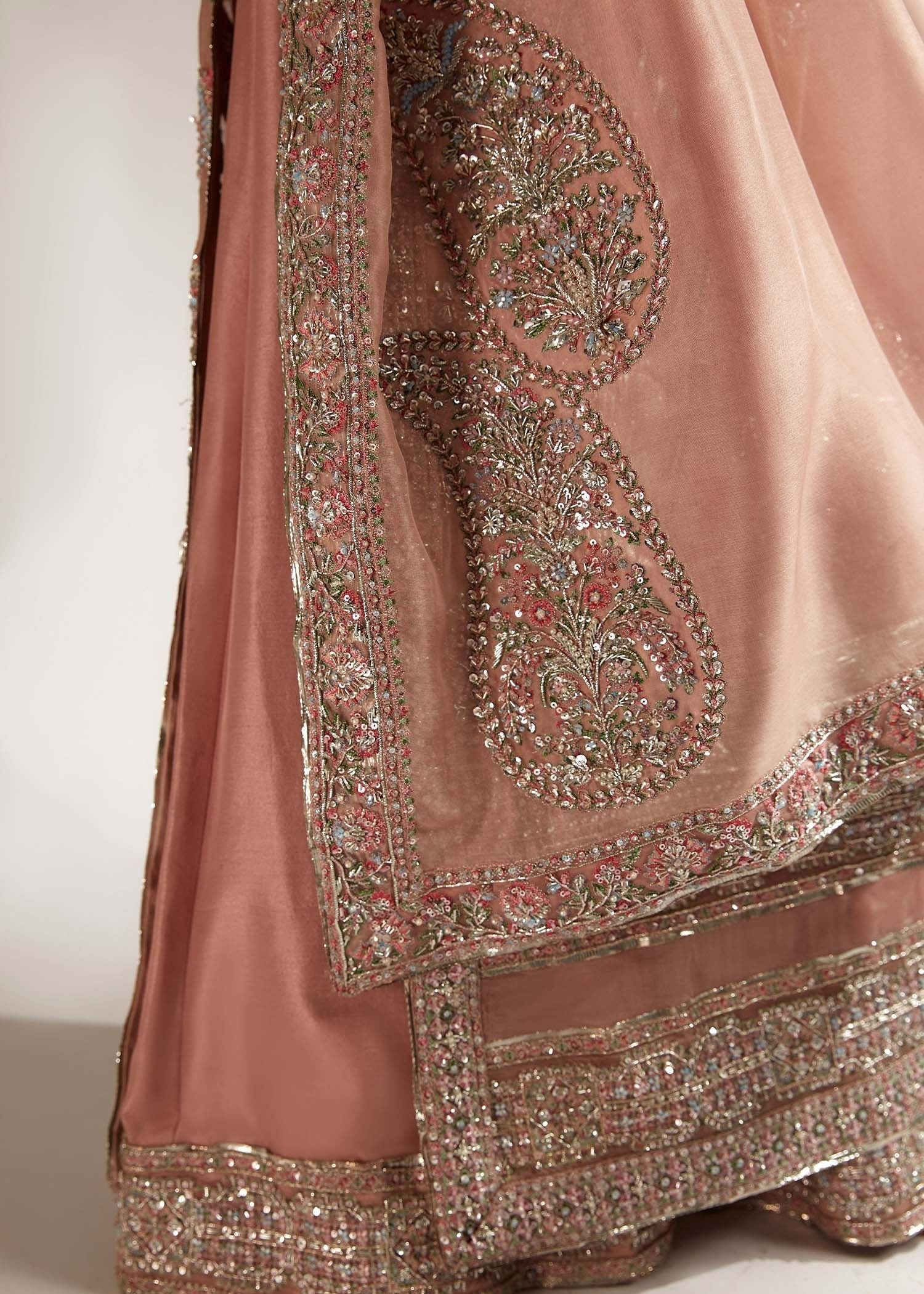 This regal outfit rendered in a beautiful shade of Pink on an organza canvas for shirt and Raw-silk palazzo, with heavy embellished motifs along with intricate details. The timeless look is completed with an organza dupatta along with four side heavy embellished borders with 3 different corner motifs embellished with sequins, cut dana and with nakashi, dabka concluding the look marvelously.