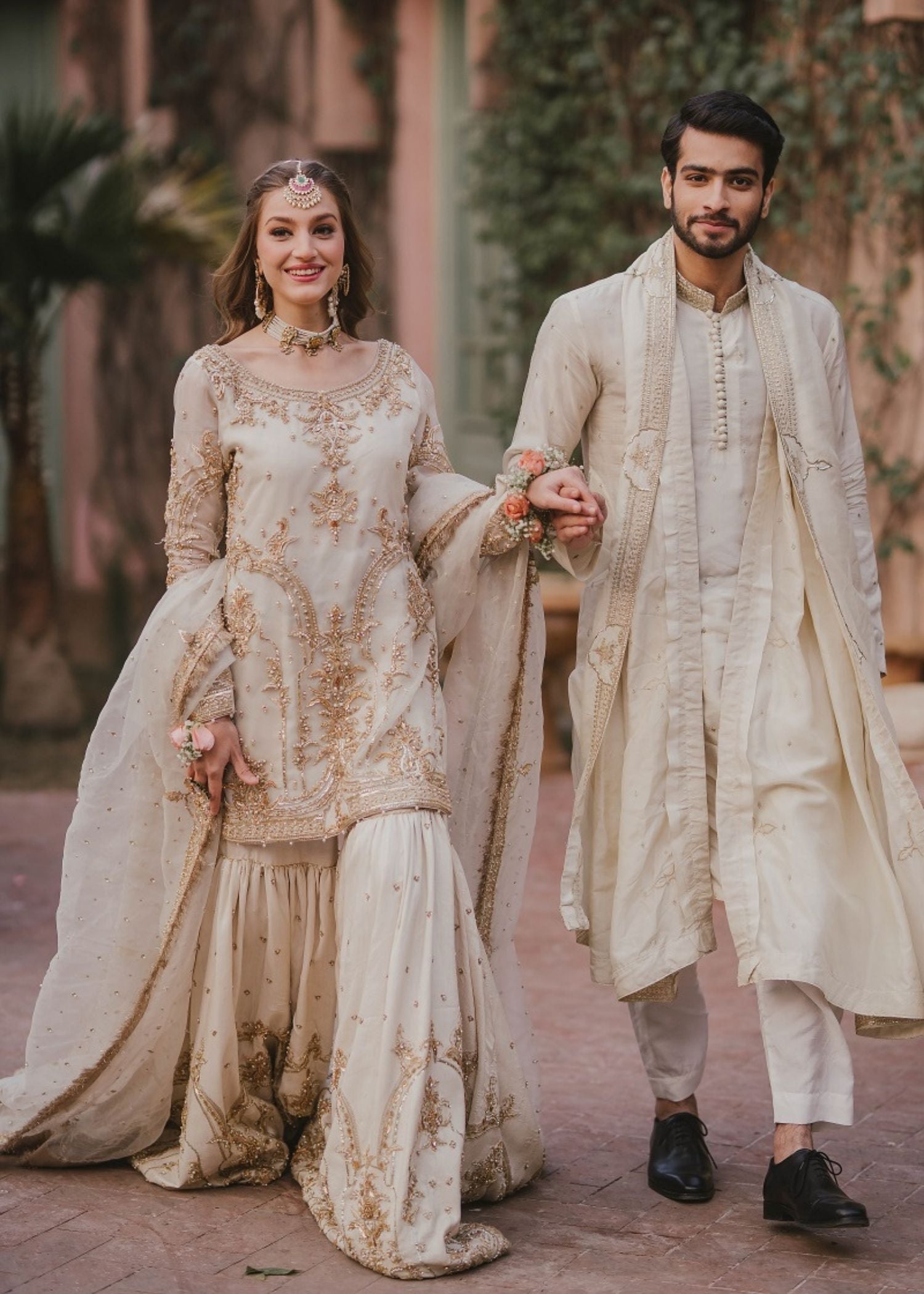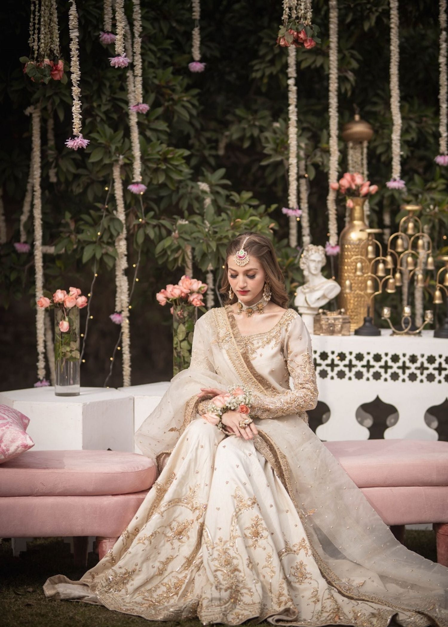 Zohra: Embodied Elegance in Ivory and Gold. An ethereal ensemble featuring an organza shirt and dupatta paired with raw silk farshi gharara. Exquisitely hand-embellished to radiate timeless beauty.